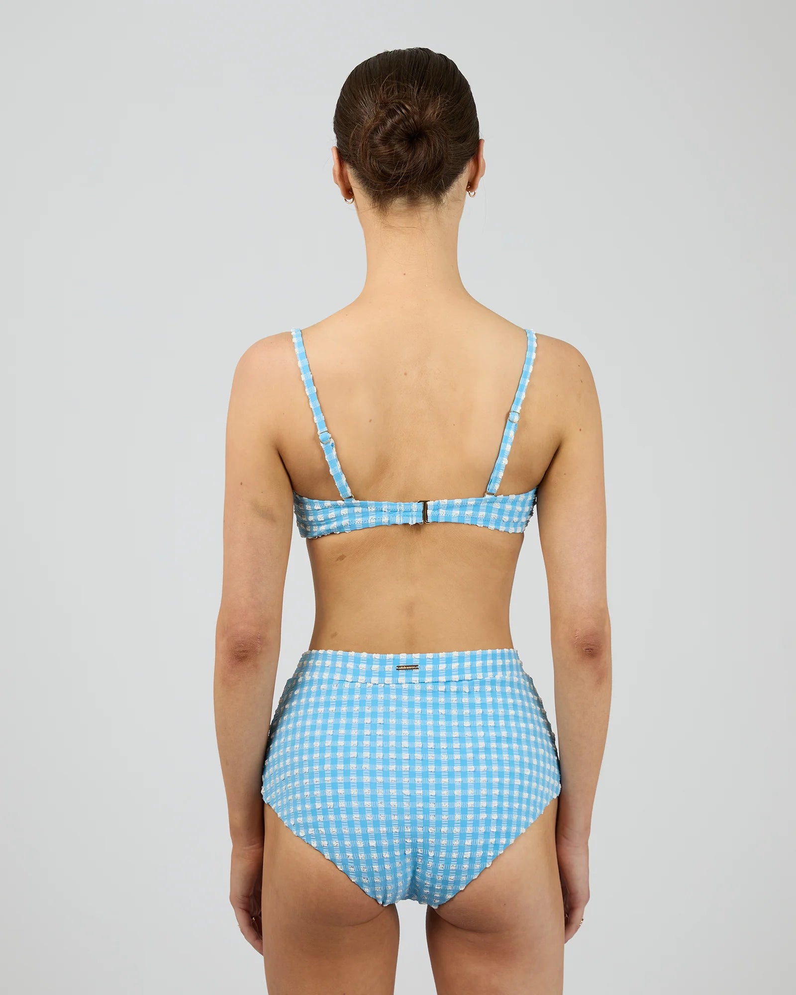 Crafted from beautiful blue gingham seersucker, the Poppy Bandeau features a soft scoop neckline and adjustable straps for a perfect fit. Pearl ring details adorn the front of the straps, adding a delicate, elegant touch. Fully lined with removable cups for customizable comfort, it’s finished with a subtle gold AAE badge discreetly placed at the back. Pair it with the Poppy Retro Pant for a polished swim look.