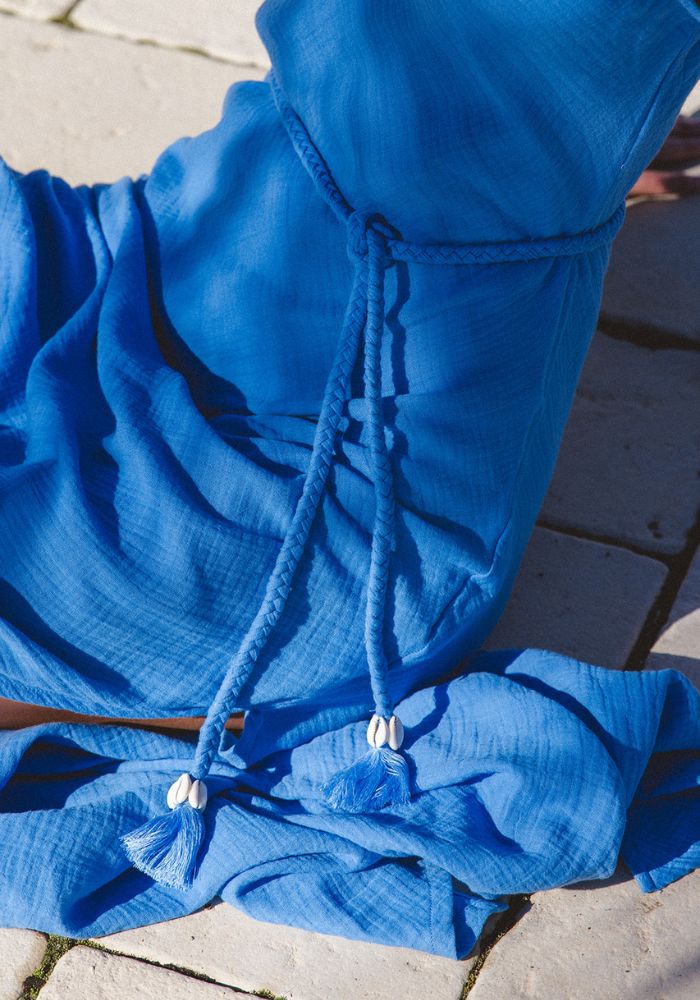 Our Island Strappy Dress in Ocean is crafted from soft cotton, this perfect summer dress features high side splits for a touch of playfulness. Complete with a plait belt adorned with shells, it exudes sophistication and luxury. Elevate your summer wardrobe with this exclusive piece.