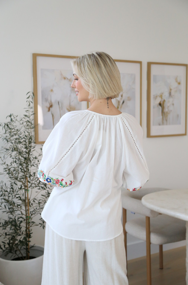 Crafted from 100% cotton, the Jasmin Embroidery Blouse offers natural breathability and softness, ensuring comfortable wear throughout the day. Its embroidered detailing adds a refined, artisanal touch, blending classic craftsmanship with modern style. Ideal for those seeking both elegance and comfort in their wardrobe, this blouse maintains durability while providing a lightweight feel.