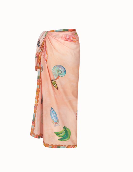 Our Pastel Sea Sarong is part of our Artist Series, featuring Annie Everingham’s hand-painted artwork. Painterly pastels and expressive brushstrokes capture the quiet magic of the seaside, shells, fruits, fish, and tropical orchid motifs layered over a soft peach-wash background. A colourful watercolour stripe border frames the artwork, digitally printed on a semi-sheer, lightweight cotton voile.