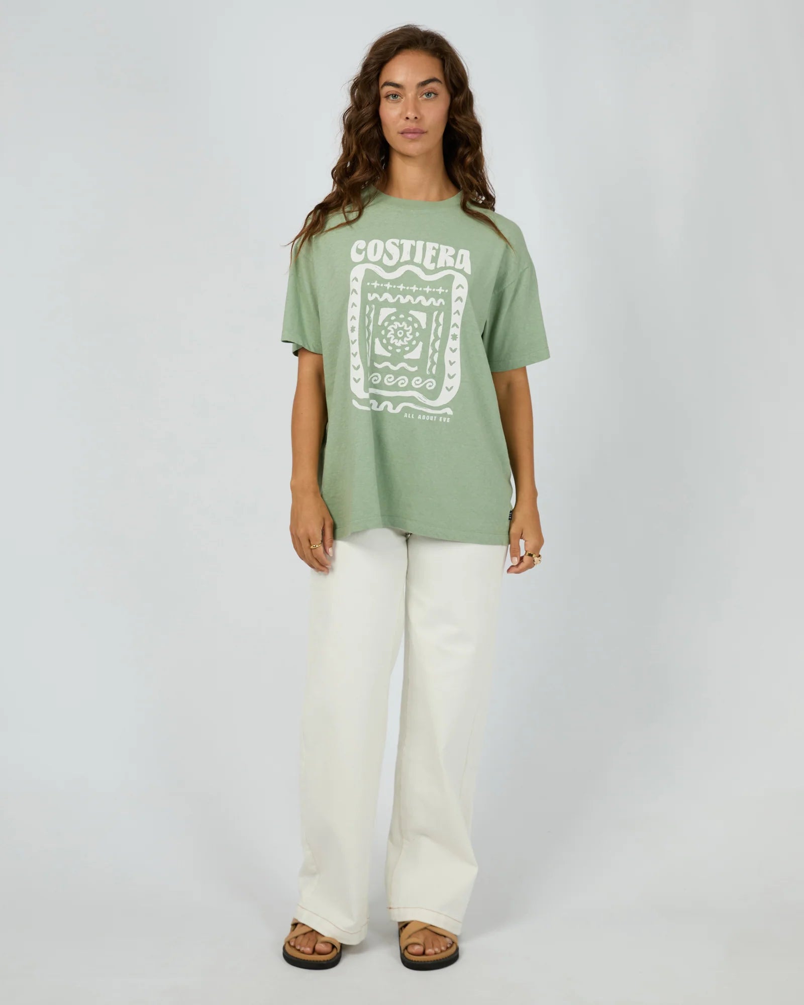 The Costiera Relaxed Tee in sage green offers effortless cool with its laid-back fit and soft, breathable fabric that keeps you comfortable all day. Featuring a bold white hand-drawn organic print, it adds an artistic edge to a neutral palette. Style it with high-waisted jeans or tailored shorts for a relaxed yet refined everyday look that transitions seamlessly from day to night.