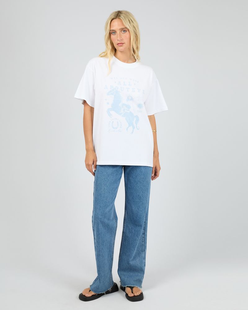 Saddle up in comfort with the Giddy Up Relaxed Tee. Crafted from soft, breathable cotton, this laid-back essential features a relaxed fit that lets you move freely without any fuss. Perfect for lazy Sundays, casual outings, or whenever you want to keep things breezy and cool. The timeless white hue pairs effortlessly with everything in your wardrobe, making it a go-to staple you'll reach for again and again.