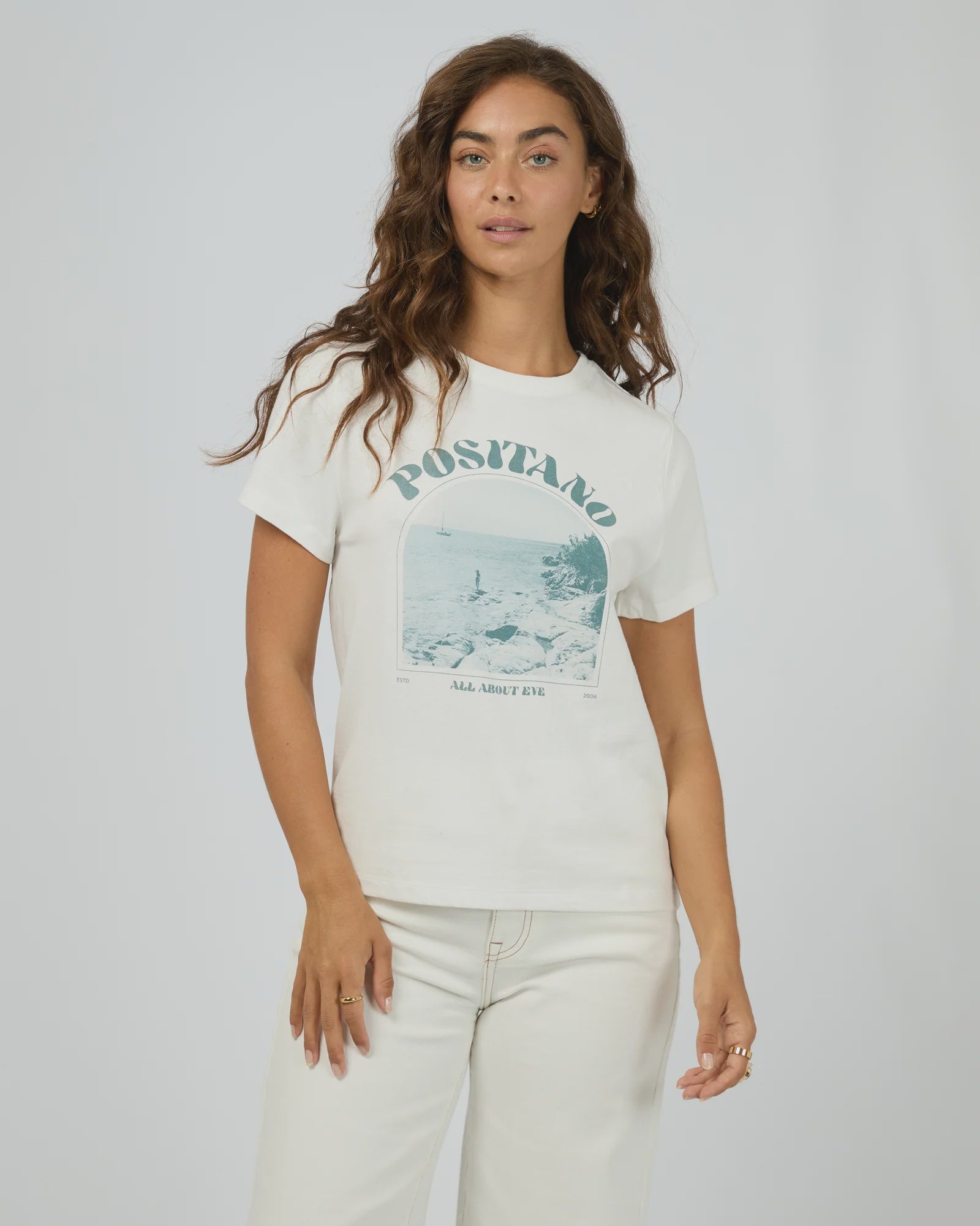 The Positano Regular Tee captures laid-back coastal vibes, featuring a bordered image of the Positano coastline in soft, washed blue tones. Set on a vintage white tee, it's the perfect blend of travel nostalgia and everyday ease. Pair it with relaxed denim or linen shorts for effortless spring styling.