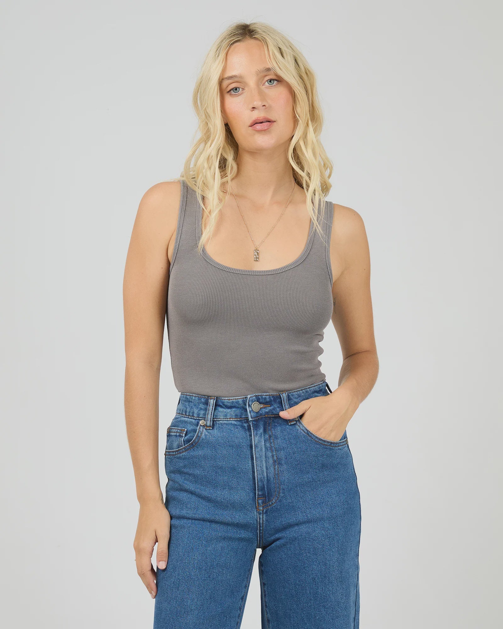 The Washed Rib Scoop Neck Tank features a flattering scoop neckline and a soft washed rib fabric in charcoal, offering both comfort and style. Perfect for layering or wearing on its own, it provides a sleek fit that moves with you throughout the day.