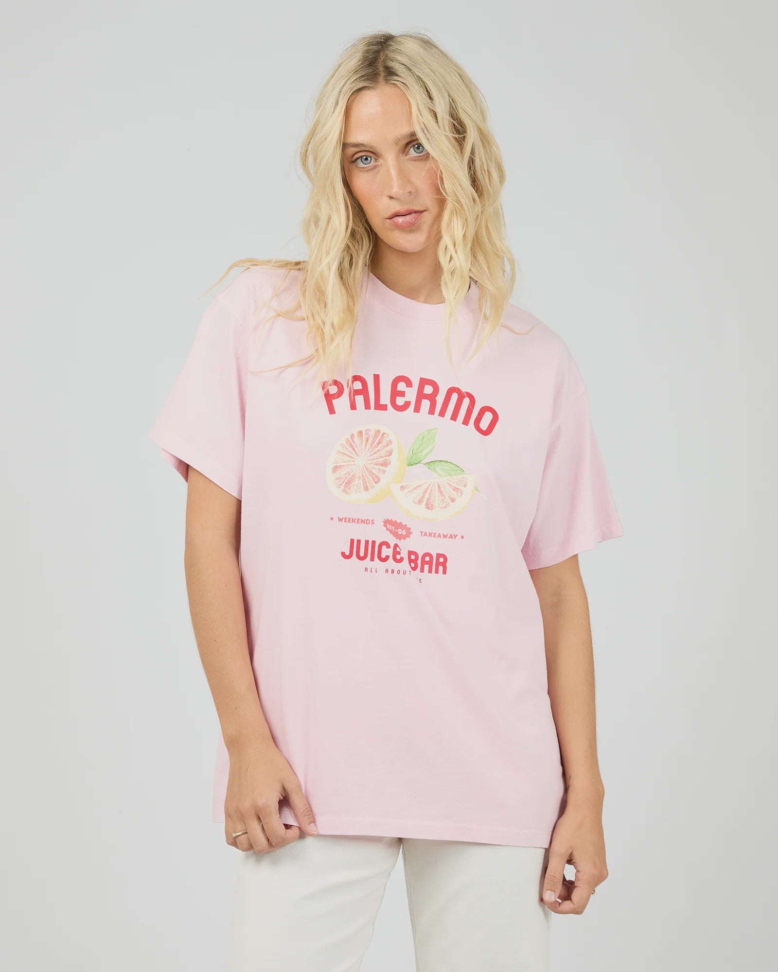 The Palermo Relaxed Tee brings a bold twist to everyday wear with its charcoal base and striking red text, finished with a playful grapefruit graphic for a fresh, zesty vibe. Its relaxed fit and soft cotton fabric make it a go-to for effortless style. Pair with denim or wide-leg pants for an easy, standout look.