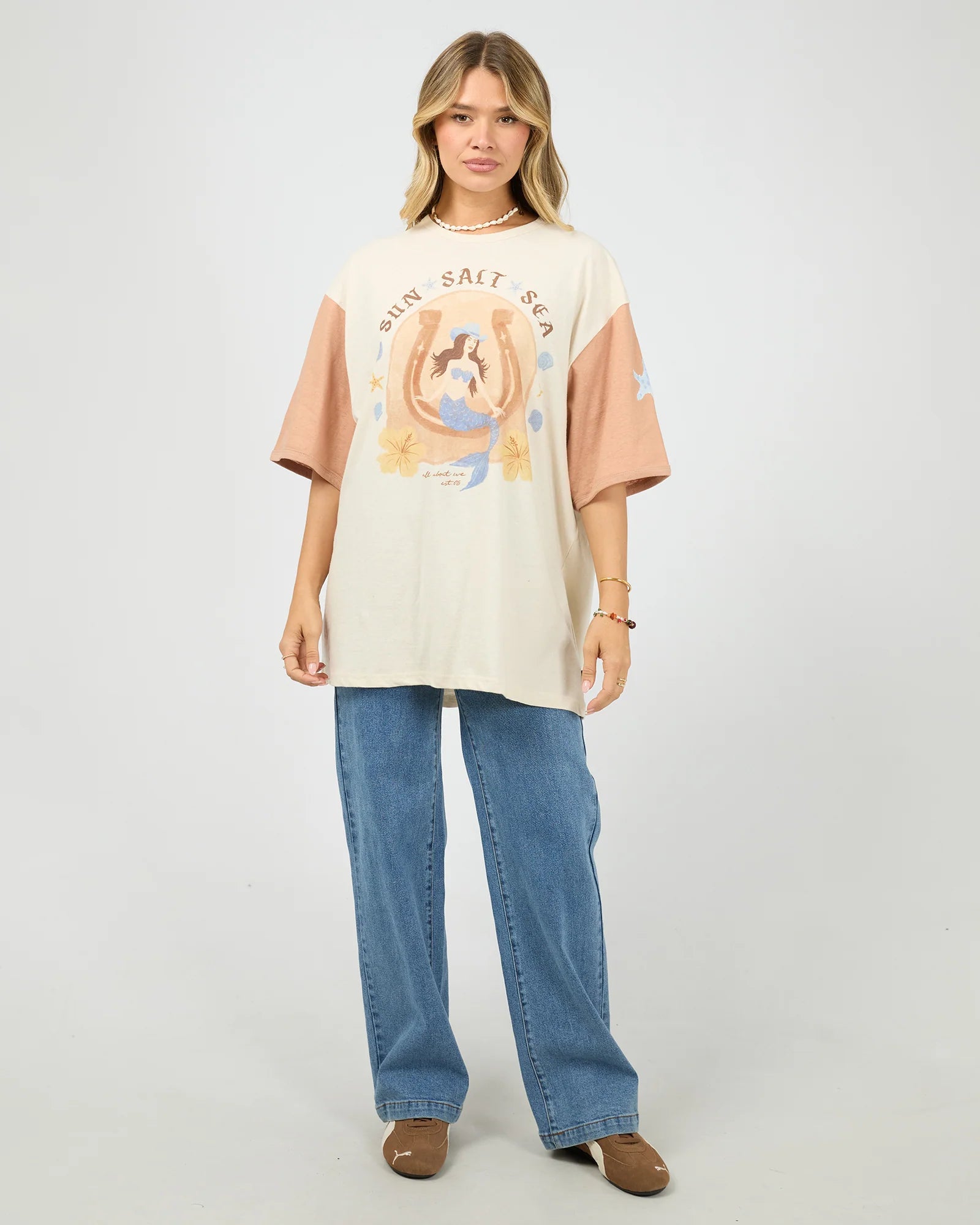 The Sun Salt Sea Oversized Tee in Vanilla offers a comfortable, relaxed fit with short sleeves and stylish contrast panelling. Graphic details on both the front and back add a distinctive look, making this tee a versatile choice that supports your casual wardrobe with effortless style and comfort.