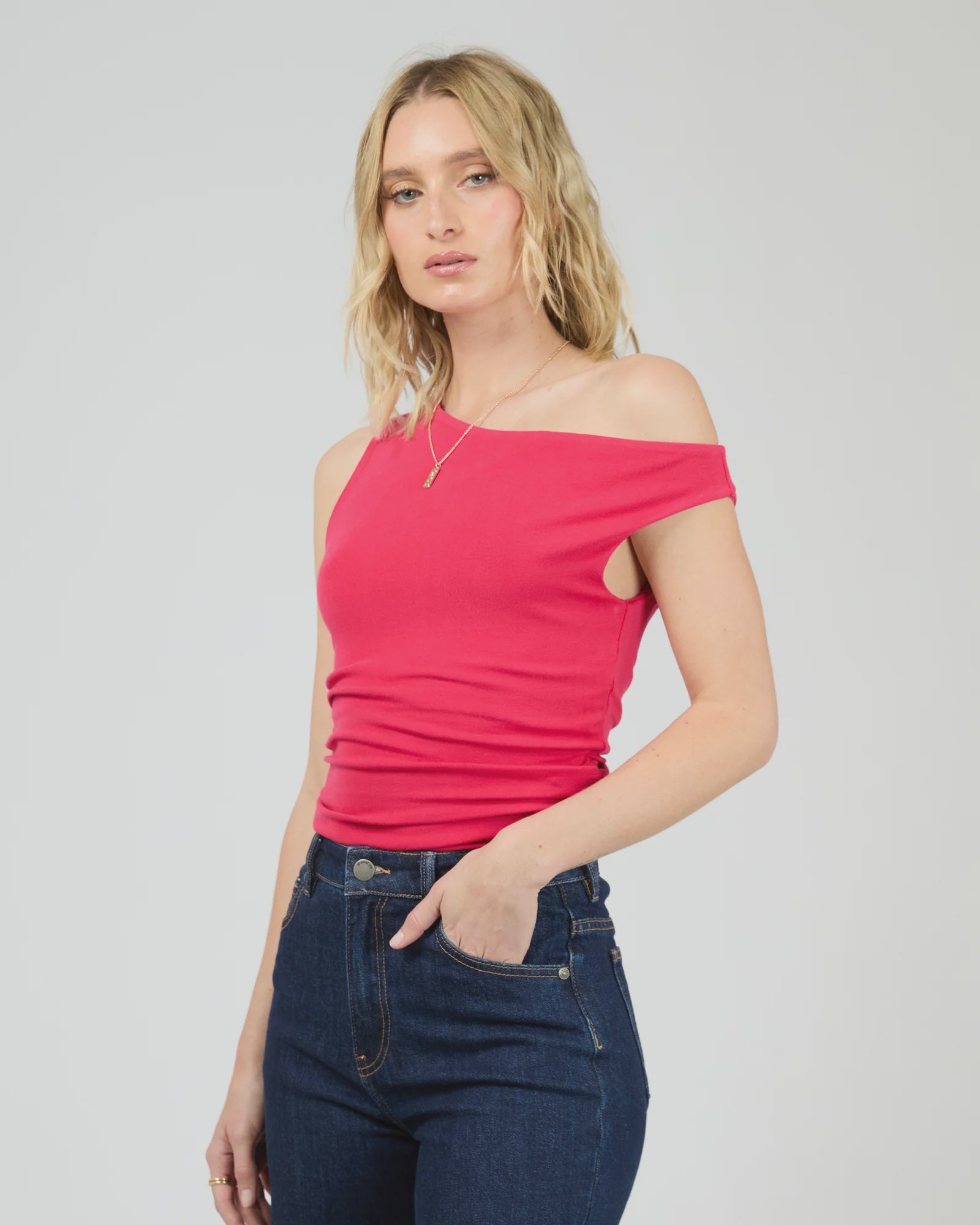 This off-shoulder stretch top combines effortless style with a comfortable fit. Crafted from a soft, stretch fabric, it hugs the body while offering plenty of stretch for a perfect, figure-hugging line. The asymmetric off-the-shoulder design adds a touch of elegance to any outfit. The ruched detail to the side body creates a cute fashion detail. For a dressier look, pair back with skirts or for something more casual back with jeans. Available in versatile neutral colours, our Kylie top is a must-have addition to any wardrobe.