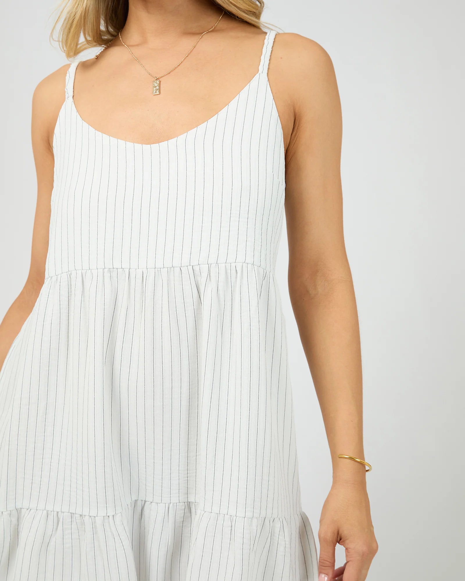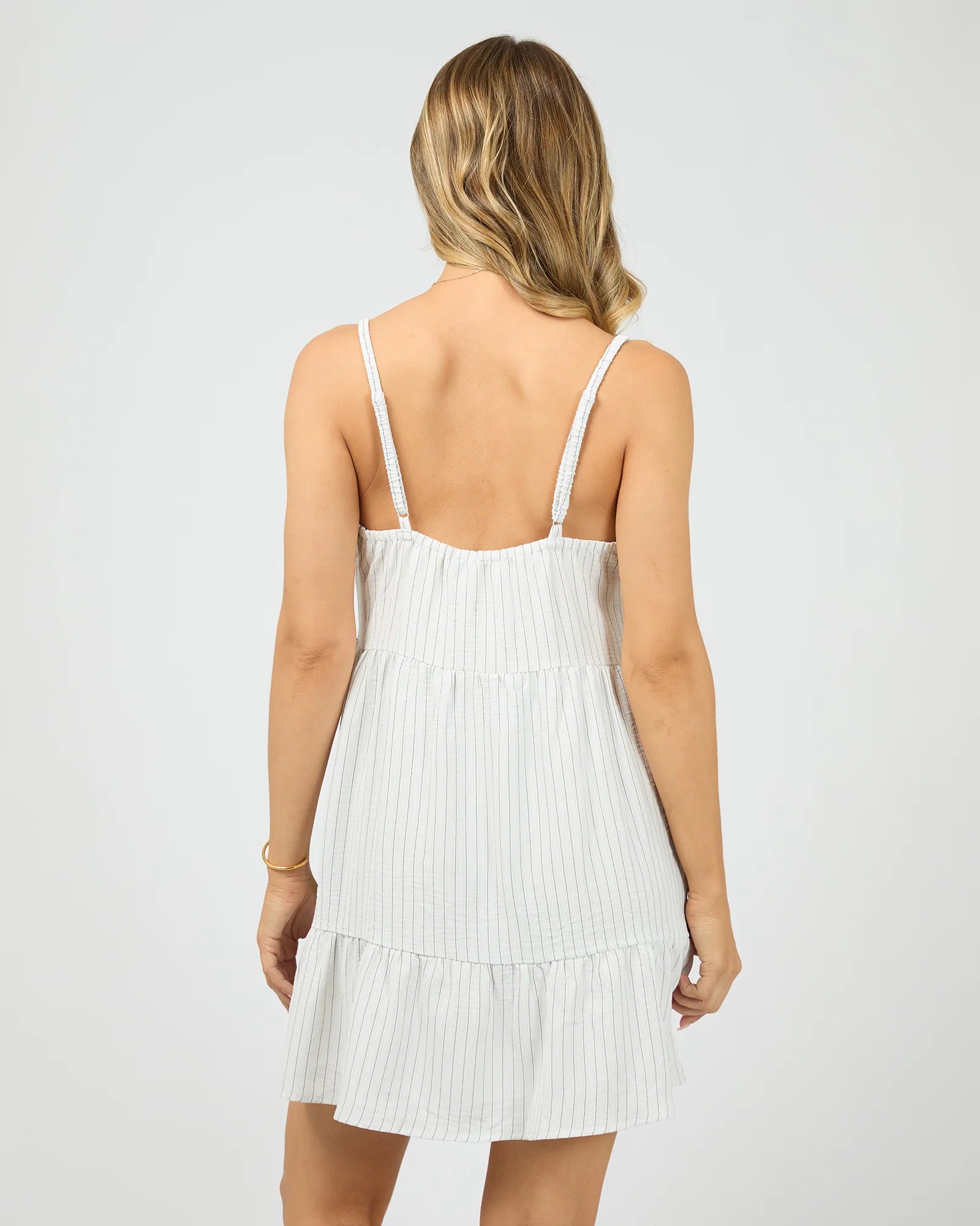 A warm-weather essential, the Sabbia Stripe Mini Dress is the perfect throw-on style for sunny days and beachside escapes. Made from a lightweight striped fabric, it features a flattering V neckline and self-fabric elastic straps for easy comfort. The relaxed silhouette is finished with side seam pockets and a tiered skirt with soft gathers for a playful, feminine touch. Ideal as an over swim piece or dressed up for summer outings.