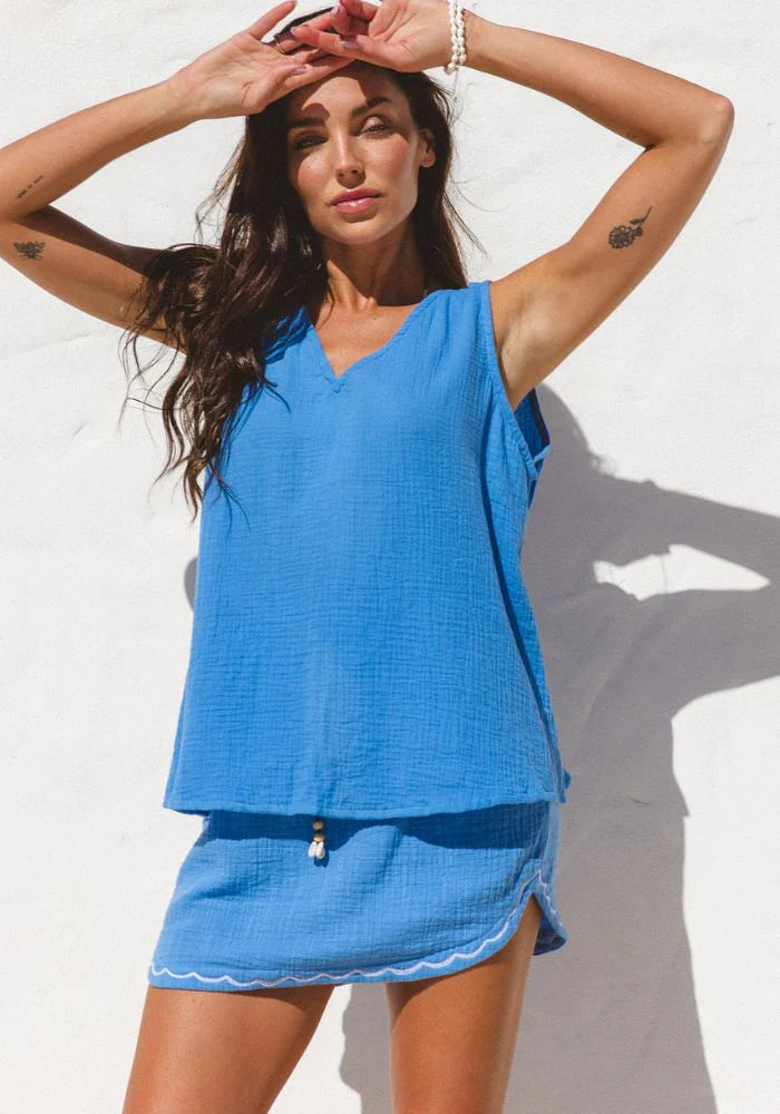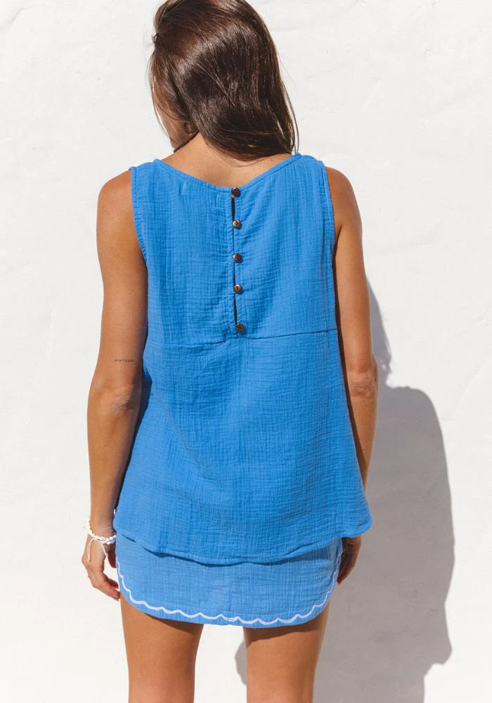 The Vespa Tank by Cabo combines stunning ocean blue with ultra-soft cotton for all-day comfort. Its flattering vee neck and relaxed fit make it effortlessly stylish, while the unique coconut buttons at the back add a distinctive touch. Elevate your casual wardrobe with this versatile tank that feels as good as it looks.